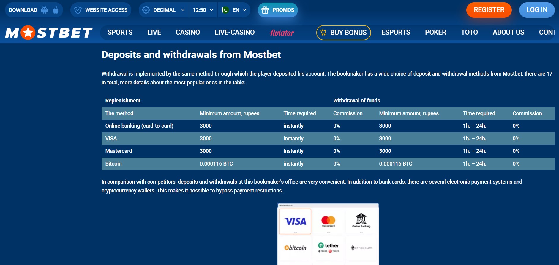 MostBet Pakistan ensures seamless deposits, withdrawals through a variety of payment methods, including: